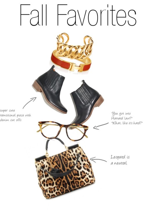 Happy October 1st! Its officially fall.. the glitter pumpkin made its debut today. As much as I complain when it gets colder than 70 degrees I must say, I am looking forward to the fall wardrobe. My tory riding boots are dying to come out of hibernation. Ankle boots are a really good transitional piece with shorts for those awkward wardrobe days where it isn’t quite fall but isn’t quite summer either. I really love leopard this season. It is used as a neutral and it is genius. Leopard and red, leopard and cobalt, leopard and creme… the list continues. Studs are a great way to add a little hint of edgy into your wardrobe. Just make sure your clothes don’t look like push pins on a cork board. The arm party continues and I am seeing a lot of the gold, large link chains. When it comes to arm candy the more the merrier.