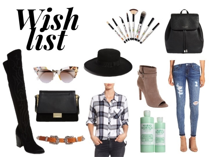 Dolce Vita over the knee boots // Fendi sunglasses // Hinge hat // Makeup brushes // Marc Jacobs backpack // B-low the belt // Rails flannel shirt // Mario Badescu cleansing gel // Smashbox makeup brushes // Vigoss skinny jeans // BCBGeneration peep toe booties // Vince Camuto bag //