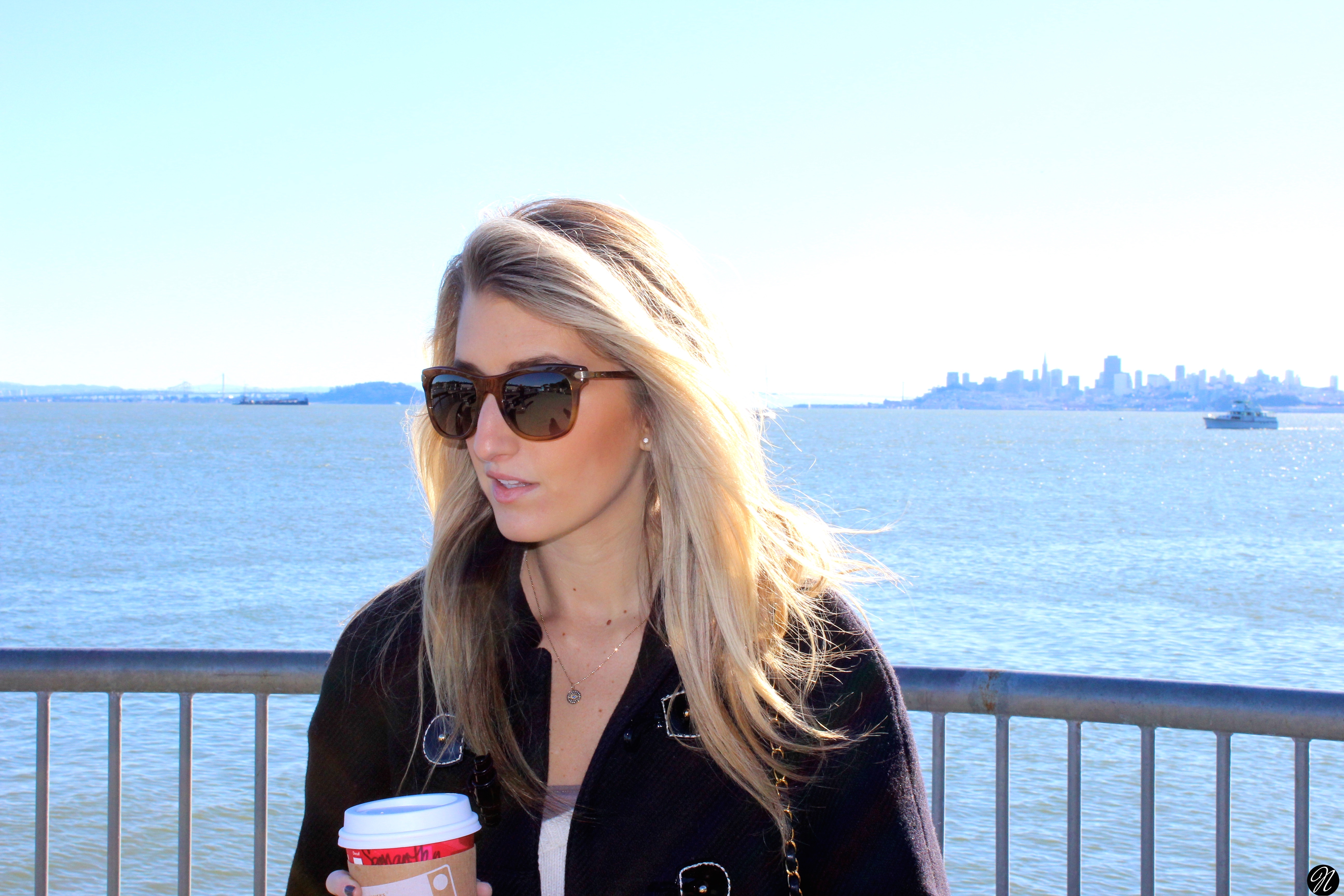 Sunglasses: Oliver Peoples // Coat: Kate Spade// Pants: J.Brand // Necklace: Feathered Soul